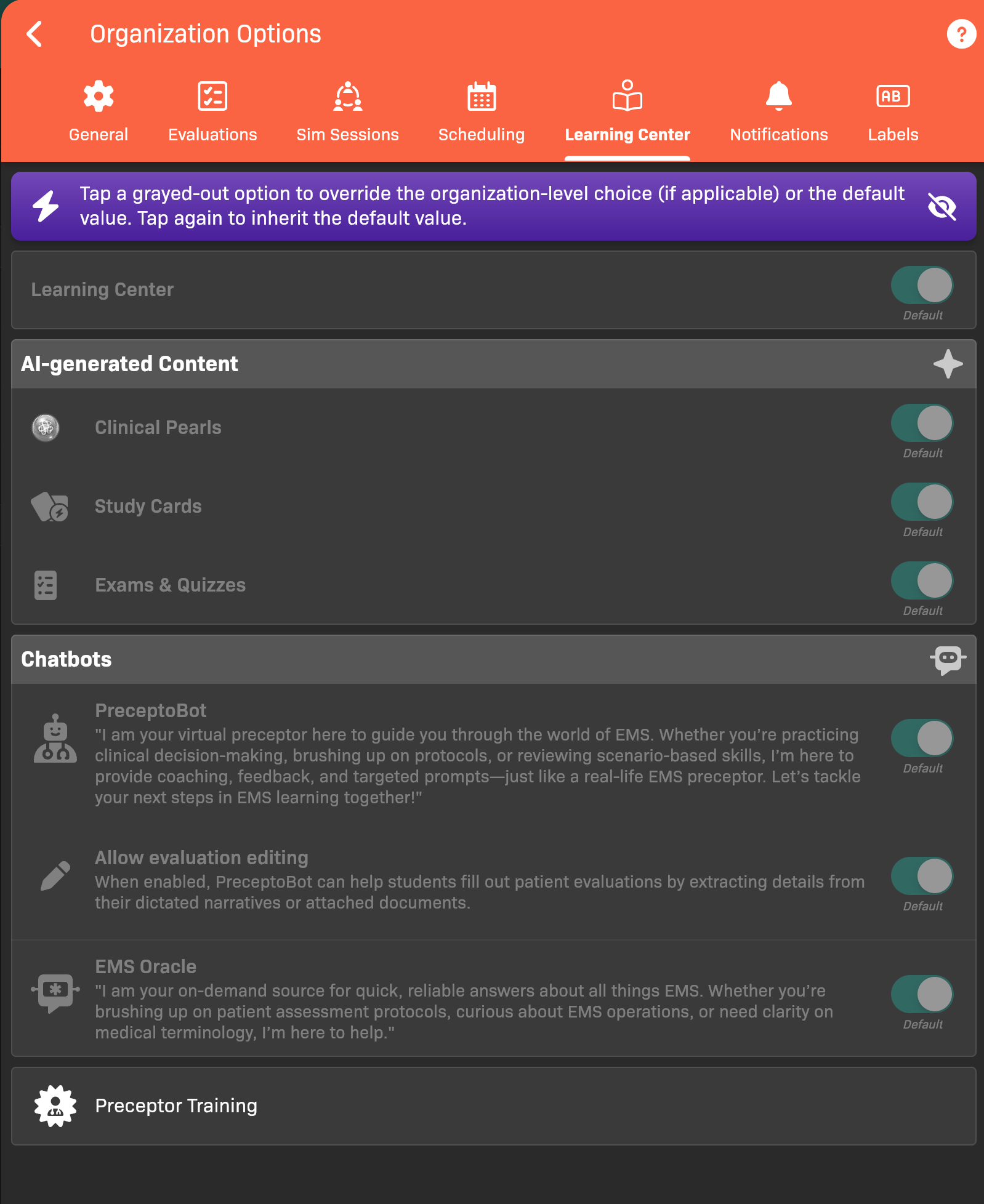 Section titled “Learning Center tab”The Learning Center tab controls AI tools such as PreceptoBot.