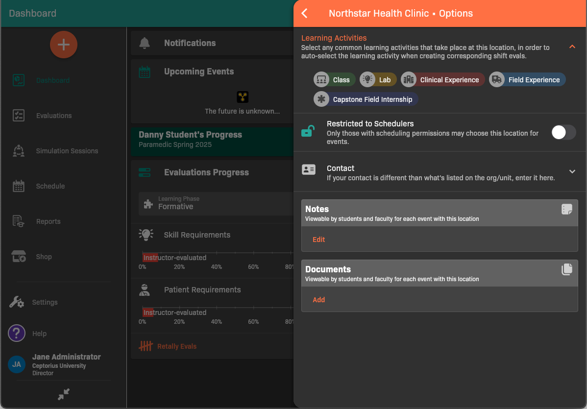 Section titled “Configuring schedule location options”Configure options if you’d like to select common learning activities that take place there, restrict the location to schedulers, add a contact, add notes, or add documents.